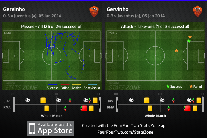 Amazingly, Gervinho actually ended the game with a 100% pass completion rate. But the passes were all in deep positions, and Conte would have been happy with him playing in those zones. More pertinently, he only dribbled past an opponent once and had no shots, in stark contrast to his recent man-of-the-match performance against Fiorentina.