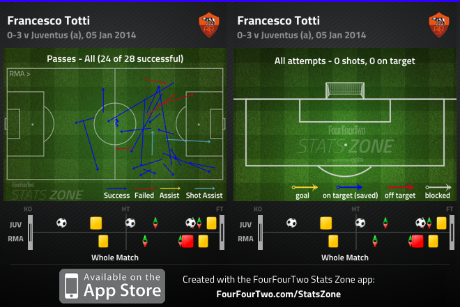 This was the key feature of the game. Roma have been absolutely superb on the break this season – the way Totti prompted quick breaks against Inter earlier in the campaign was counter-attacking at its finest, and while that was predominantly in situations where Roma had been defending set-pieces, he's capable of the same in open play.
